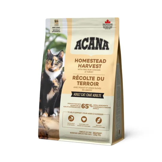 Our ACANA™ Homestead Harvest Recipe satisfies your cat with plenty of protein-rich poultry. Rich with 65% quality animal ingredients including free-run chicken and turkey, Homestead Harvest is crafted with the animal protein your cat needs to be their best. This nutrient-dense recipe also helps support key health benefits for your cat, including shiny coat & healthy skin, strong muscle & bone maintenance, and healthy digestion & immune system. Nurture your feline with a poultry-rich recipe tailored to keep them healthy and happy with ACANA Homestead Harvest!
