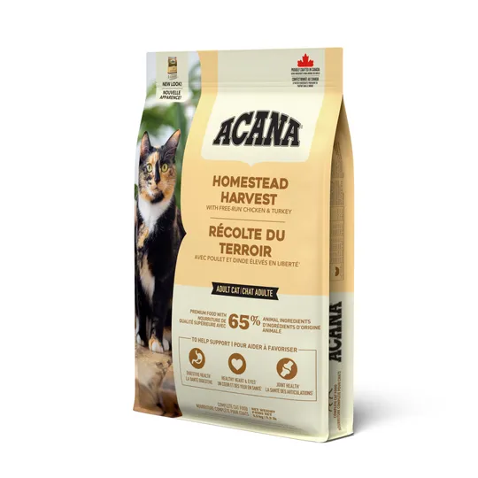 Our ACANA™ Homestead Harvest Recipe satisfies your cat with plenty of protein-rich poultry. Rich with 65% quality animal ingredients including free-run chicken and turkey, Homestead Harvest is crafted with the animal protein your cat needs to be their best. This nutrient-dense recipe also helps support key health benefits for your cat, including shiny coat & healthy skin, strong muscle & bone maintenance, and healthy digestion & immune system. Nurture your feline with a poultry-rich recipe tailored to keep them healthy and happy with ACANA Homestead Harvest!