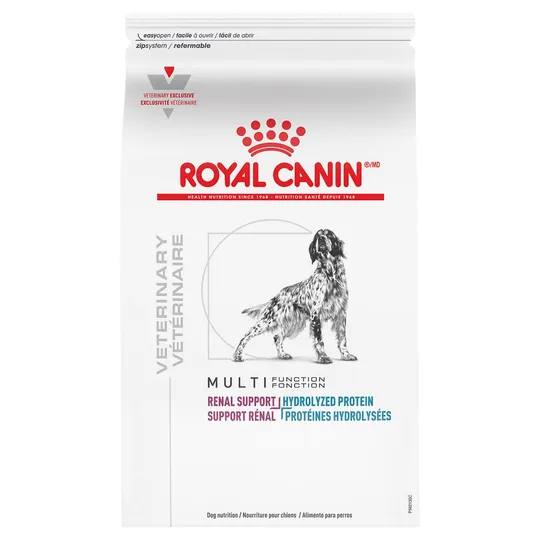 Renal support -Formulated with low phosphorus and restricted protein of high quality to support renal function, helping to improve the dog’s quality of life.