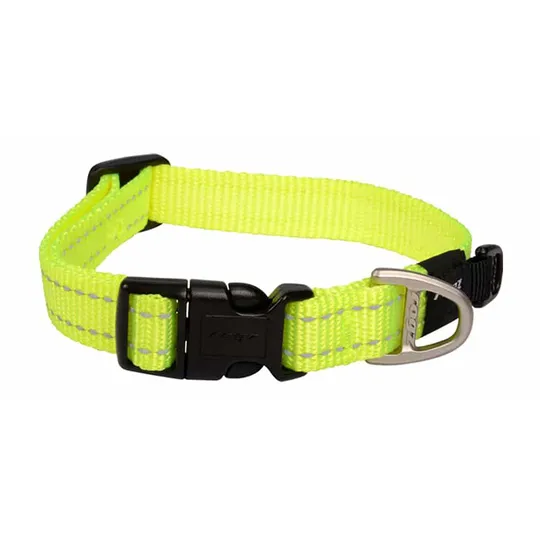 This dog collar features reflective yarn woven into the webbing for night time visibility. Rogloc buckle is the Fort Knox of release buckles. Low Load Technology reduces the load on the Titanium plastic buckle through a cleverly positioned load ring. Custom designed die cast ring (no welding). Electroplated chrome for a tarnish free finish. Rogz contoured plastic components ensure that every Rogz collar fits snuggly.