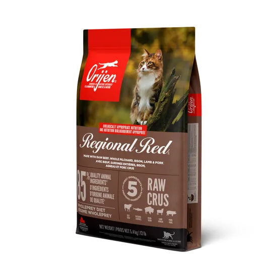 Help your cat thrive with the power of protein-rich recipes that provide peak nourishment. As obligate carnivores, modern cats are built like their ancestors and thrive on a Biologically Appropriate diet rich in protein and fat sourced from a variety of animal ingredients. ORIJEN® Regional Red diet is made with meat from raw beef, whole pilchard, wild boar, bison and lamb. Packed with WholePrey animal ingredients like meat, fish, organs and bone, ORIJEN Regional Red diet is made with the most nutrient-dense, succulent parts of the prey to deliver the nutrition cats need. With 85% quality animal ingredients and a freeze-dried liver coating, this diet is beyond comparison.