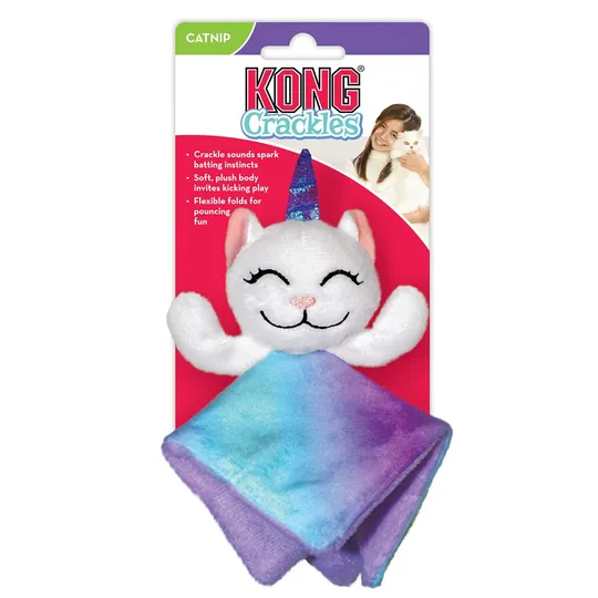 KONG Crackles Caticorn’s crackle sounds call cats to play, sparking batting instincts for magical bouts of healthy kicking fun. The soft plush body and easy to tousle folds encourage kicking and pouncing play that rewards natural instinctual behavior. This magical friend’s soft plush body invites snuggles that make it an ideal cuddle toy. KONG Premium North American catnip continues the engagement.