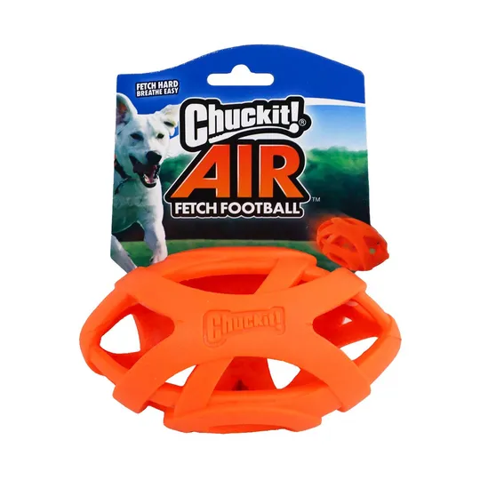 Run farther, fetch longer® with the Chuckit!® Breathe Right® Fetch Football! This high performance, patent pending ball is designed to allow your dog to run farther and fetch longer during playtime. The hollow, mesh-like design facilitates breathing and airflow into the dog's lungs while running and fetching.